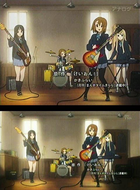 キャプは けいおん! のOPですけれど、澪のベースのヘッドがちゃんと入っていたり、紬の上手(かみて・右側)に余裕ができていたり。。。せっかくの魅力が(本作に限らず)半減していると思うのですけれどねぇ。何を考えているんでしょ、放送局は。