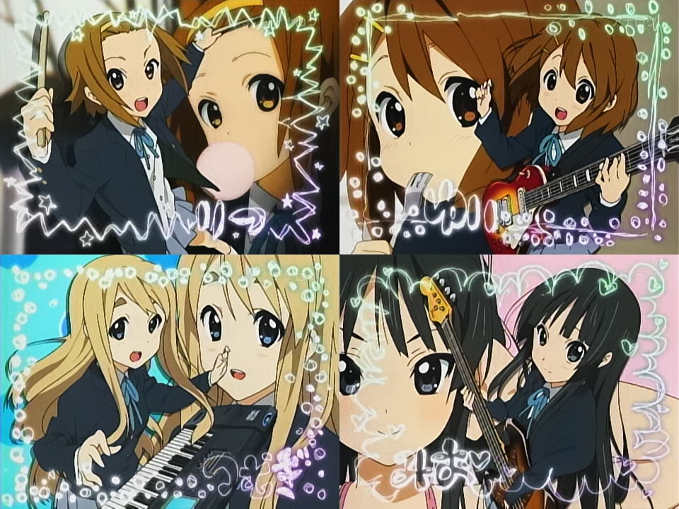 こちらは2クール?音楽素人の主人公でギターのゆい(右上)、リーダーでドラムのりつ(左上)、ゆいの親友でベースのみお(右下)、お嬢さまなキーボードのつむぎ、の4人組。さぁ、あなたは誰が好み?