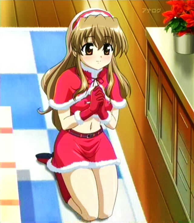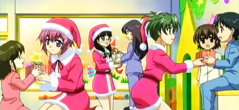 今回、ほとんど出番の無かった椎菜はというと・・・尺あわせ?にチラッとBパート冒頭に出てきました。ボランティアの施設めぐりかな?当然ミニスカサンタで、施設にはワンパクな男の子も居るワケで。。。麻衣ちゃん(メガネっ娘 ・ CV豊崎愛生)・良子ちゃん(ショートカット ・ CV喜多村英梨)ともども「犠牲」になりました。